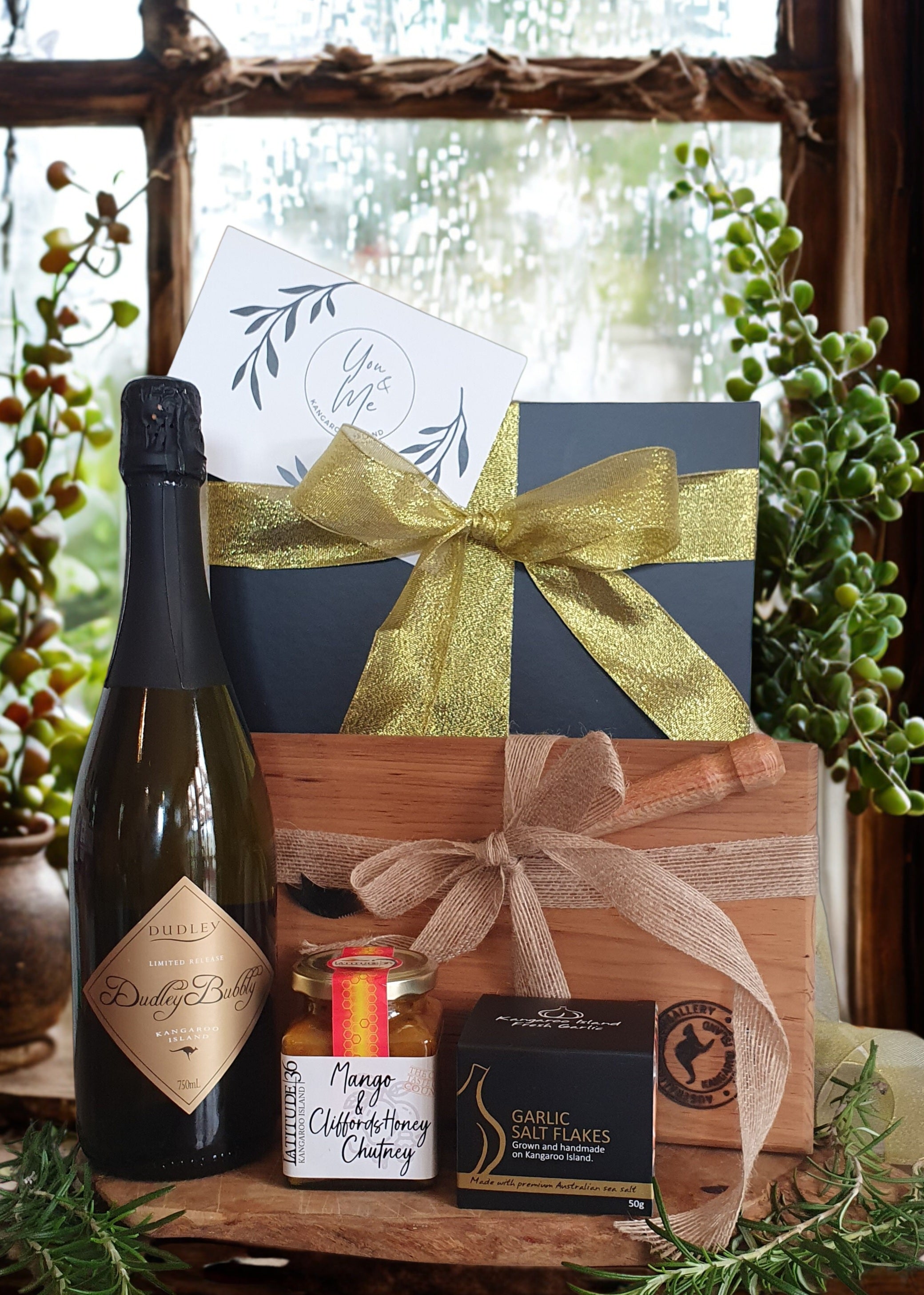 Our signature Kangaroo Island hampers feature the best of what our local makers have to offer, from cold-pressed olive oil to artisan salts, Belgian protein balls, and creamed honey. Each hamper is hand-packed with care and topped with a vibrant ribbon, making it a perfect gift for any occasion.