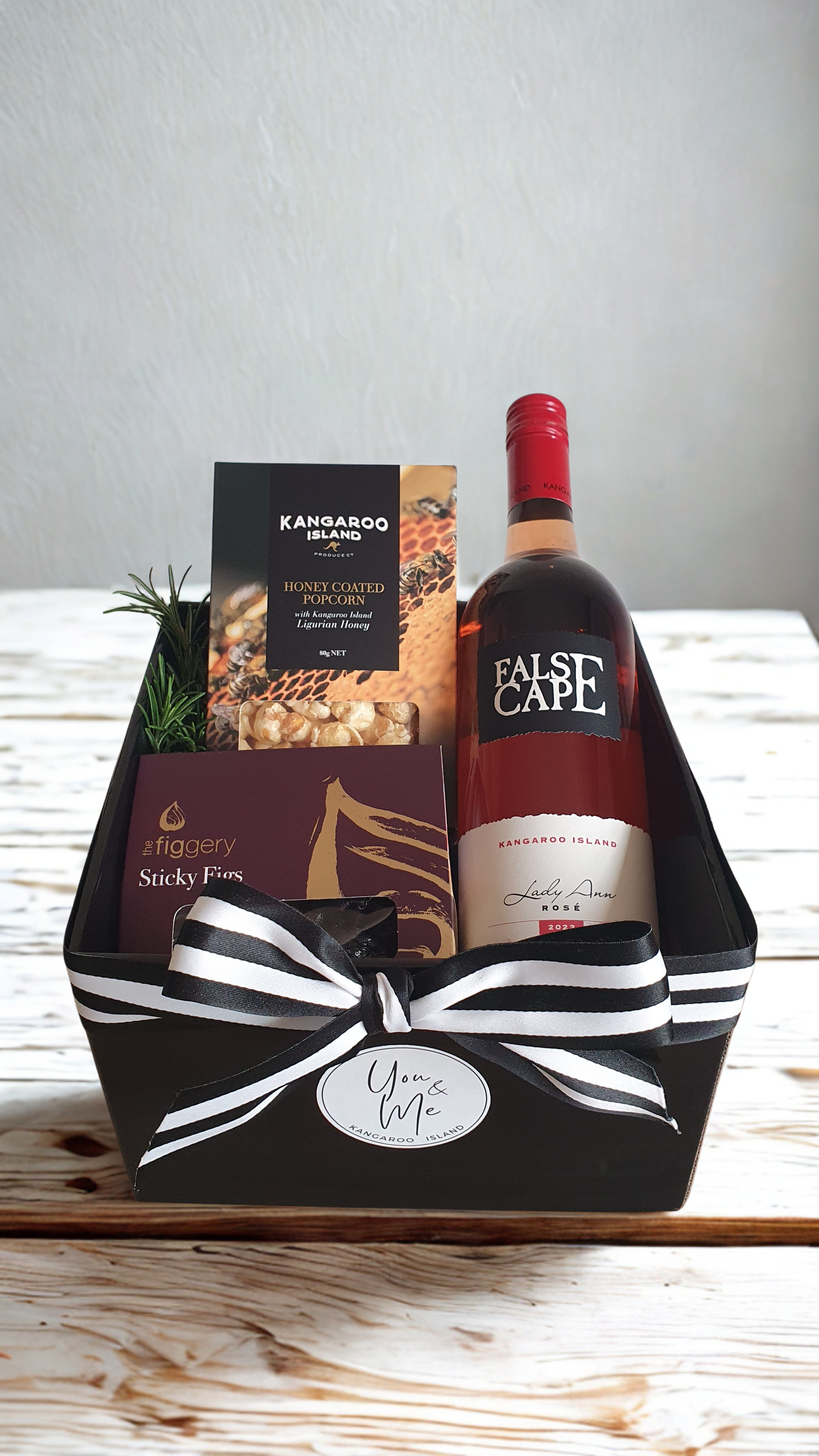 Share the perfect harmony of elegance and sweetness with The Epicurean Trio Hamper. It includes a crisp, refreshing rosé wine, complemented by luscious sticky figs and the sweet crunch of Kangaroo Island honey popcorn. This carefully curated hamper is sure to captivate the senses and make any occasion truly special.