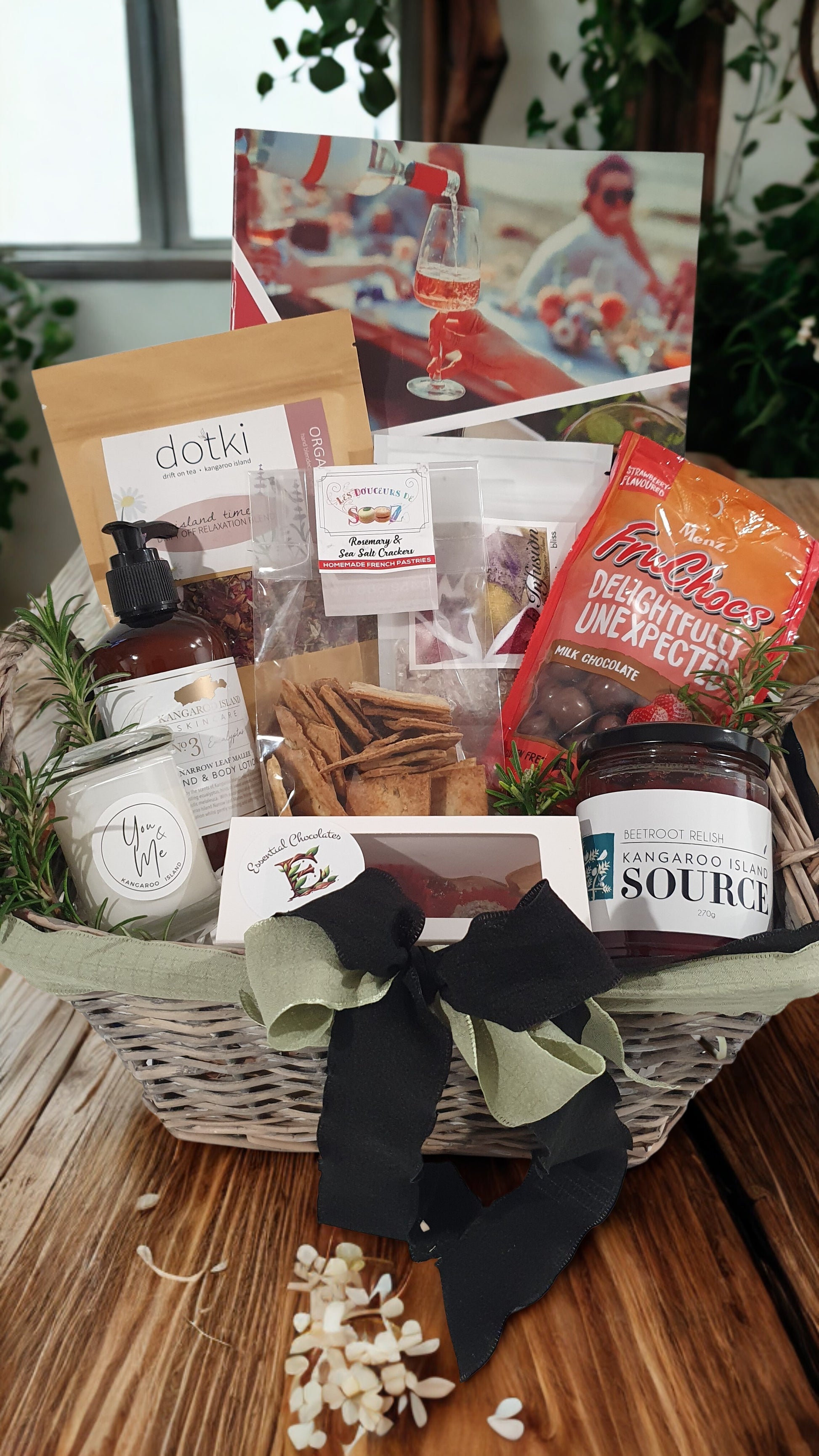 Every hamper carefully prepared in a woven basket, wooden crate, or open box, is available exclusively for delivery or pickup on Kangaroo Island to ensure our products reach their destination safely and in perfect condition.