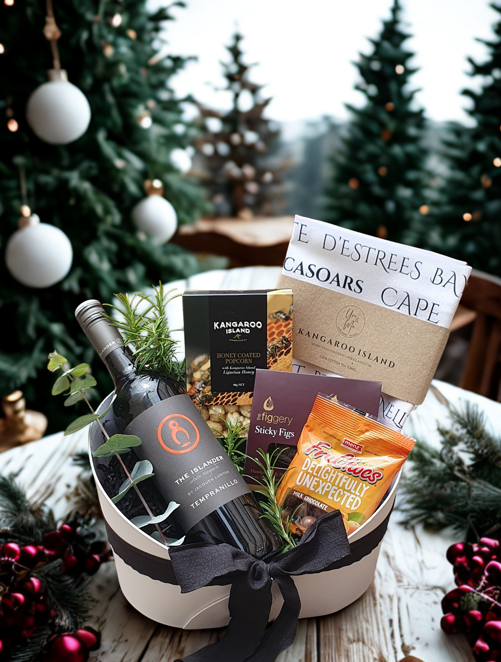 Gift The Islander & Co. A beautifully curated hamper crafted for lovers of fine flavours and gourmet delights. This luxurious selection features a rich and velvety Tempranillo wine, perfectly paired with a true local island delicacy, The Figgery Sticky Figs & Kangaroo Island Ligurian honey popcorn for a touch of golden sweetness. This hamper makes an exceptional gift for celebrations, special occasions, or simply to savour and share.